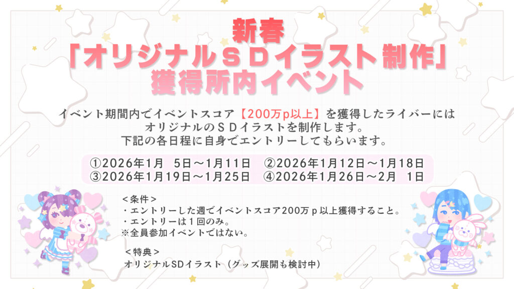 期間内でイベントスコア200万p以上を獲得したライバーにはオリジナルのSDイラストを制作します。(グッズ展開も検討中)